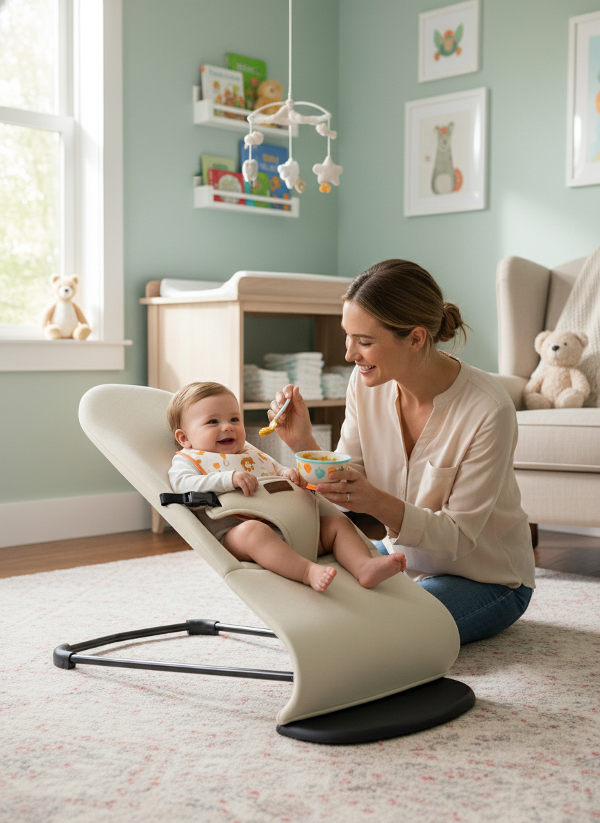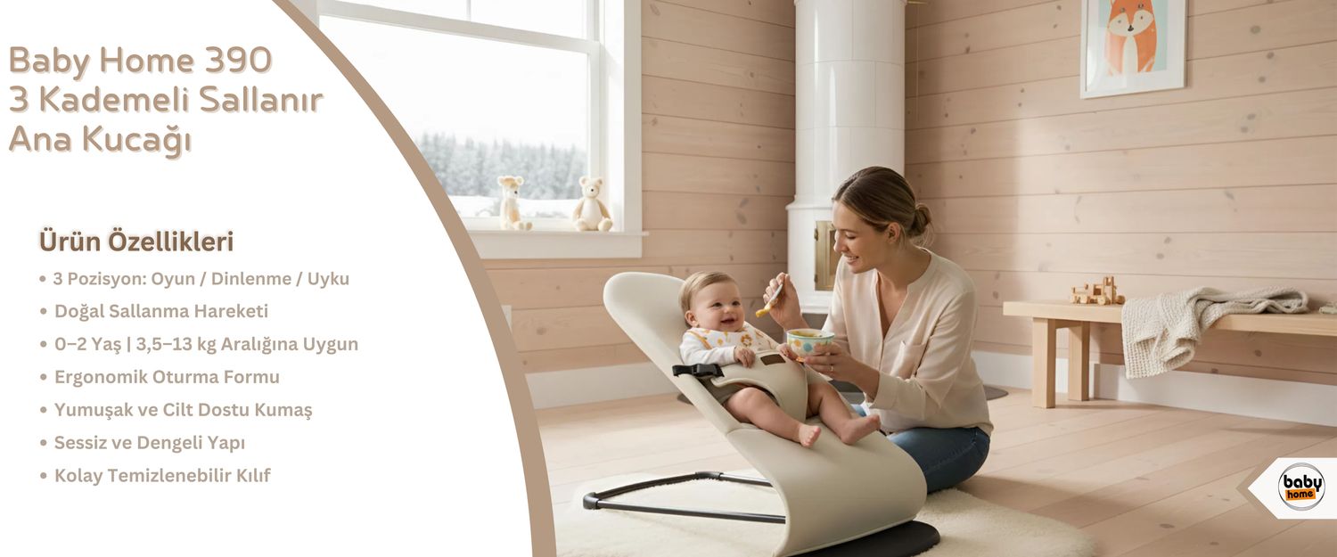 Baby Home 390 3 Kademeli Sallanır Ana Kucağı, 0–2 yaş arasındaki (3,5–13 kg) bebekler için tasarlanmış, doğal sallanma hareketiyle rahatlatan ve motor gelişimi destekleyen ergonomik bir ana kucağıdır. Yumuşak kumaşı, güvenli yapısı ve üç farklı kullanım pozisyonuyla bebeğinizin gün boyu konforlu ve güvende kalmasını sağlar.