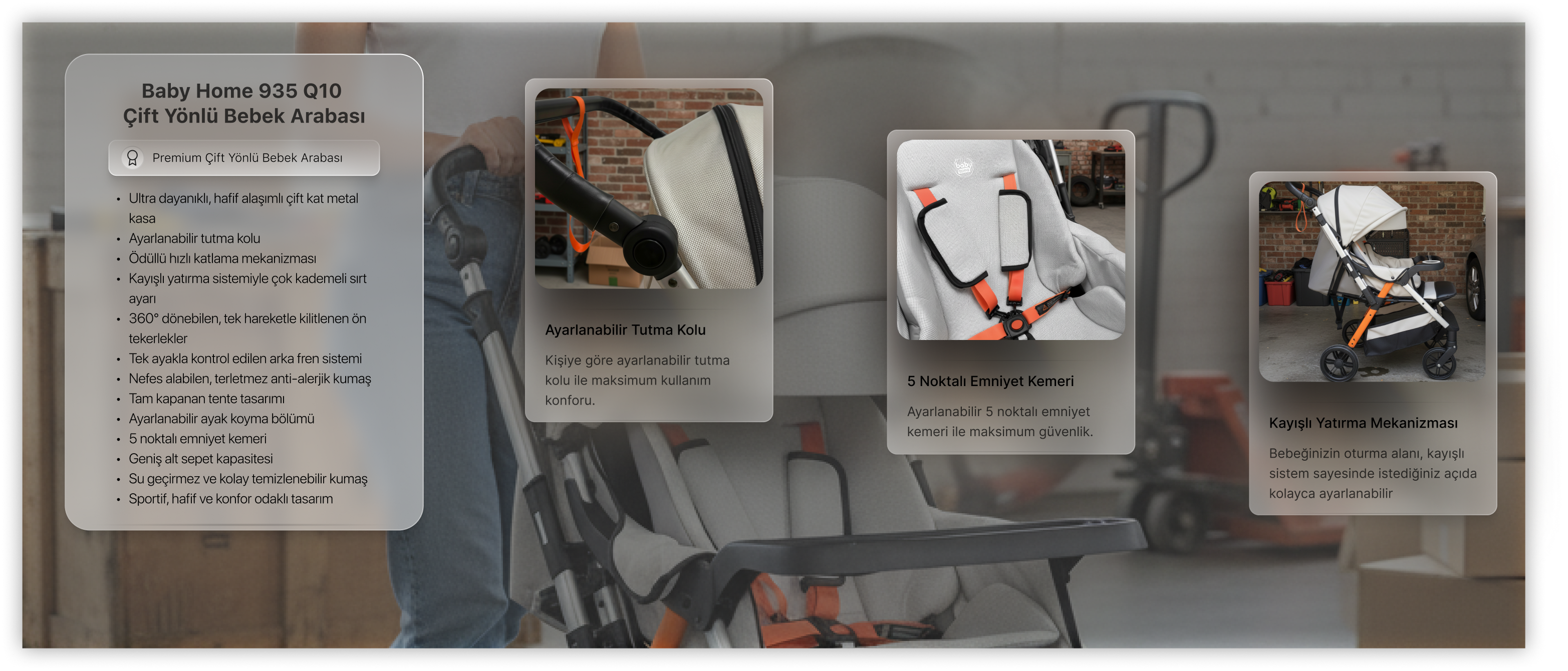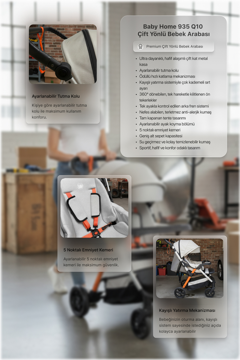 Baby Home 935 X10, hafif yapısı, çift yönlü kullanım özelliği ve konfor odaklı tasarımıyla hem bebekler hem de ebeveynler için ideal bir bebek arabasıdır. Dayanıklı metal kasası, nefes alabilen kumaşı, tam kapanan tentesi ve ayarlanabilir sürüş mekanizmasıyla günlük kullanımda maksimum rahatlık sunar.