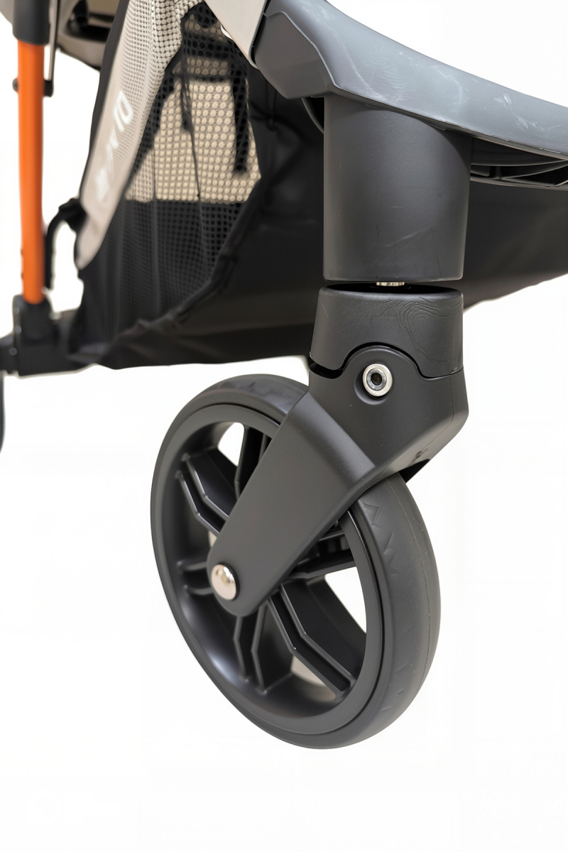 Ön tekerlekler tam dönüş kabiliyetiyle üstün manevra sağlar; tek hamleyle sabitlenebilir.